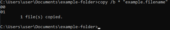 copy /b * "[name].<file extension>"and hit Enter. (Replace[name]with the filename of the file you are merging)